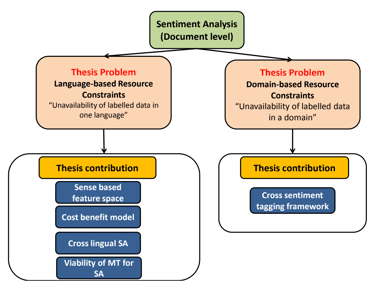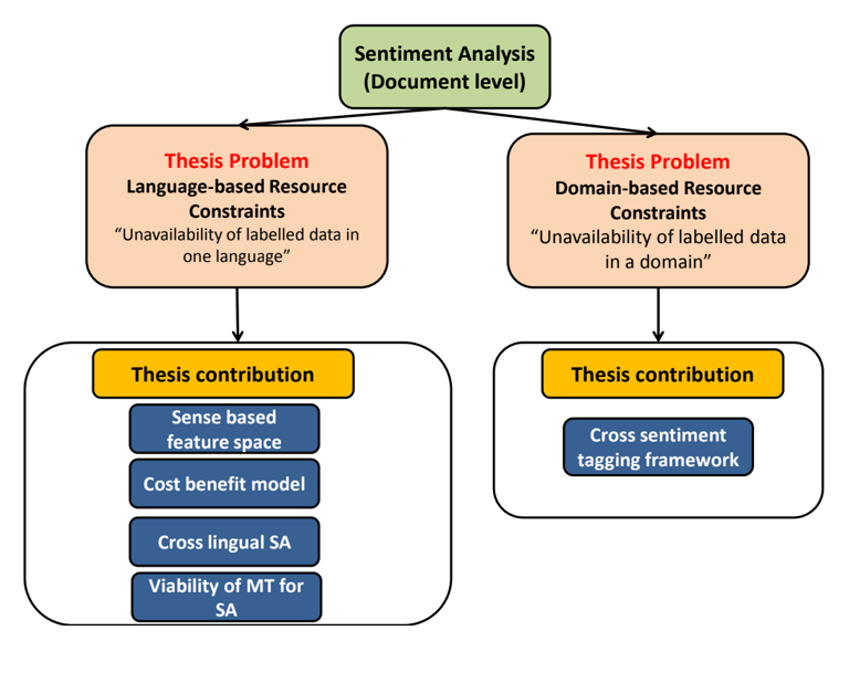 The thesis tackles key challenges in multilingual Sentiment Analysis using innovative AI approaches, presenting novel solutions for resource-constrained scenarios in language and domain adaptation. The research introduces a wordnet sense-based method that outperforms traditional lexeme-based approaches, achieving significant accuracy improvements while reducing dimensionality. The work challenges conventional machine translation-based approaches for cross-lingual sentiment analysis, providing experimental evidence across multiple European and Indian languages, while introducing an economic model for annotation cost-benefit analysis. The research concludes with an effective approach for cross-domain sentiment adaptation using confidence-threshold based noise filtering, demonstrating practical solutions for building high-accuracy sentiment analysis systems in resource-limited environments.